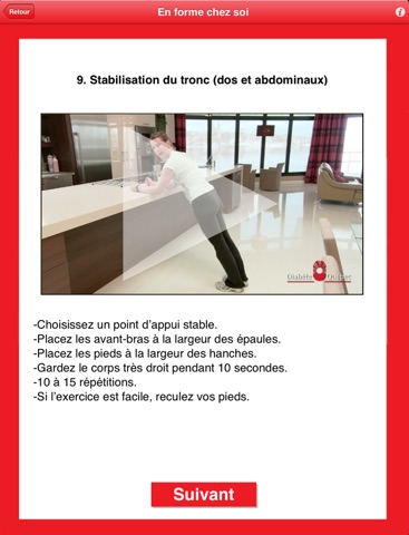 Cette application présente le programme d’exercices «En forme chez soi» de Diabète Québec. Destinées aux adultes diabétiques de type 2 ou pré-diabétiques, elle permet de commencer une remise en forme dans le confort de votre foyer. Une kinésiologue démontre et explique les exercices simples à exécuter avec des accessoires disponibles à la maison. Ces exercices ont comme but d’aider au contrôle du diabète. D’ailleurs, vous pourrez sauvegarder vos glycémies avant et après chaque séance afin de constater l’impact sur votre diabète. Bon entraînement!
