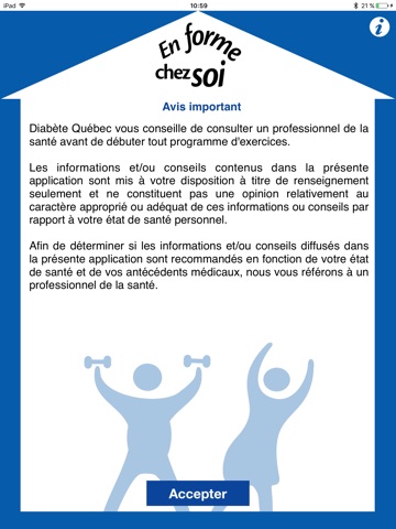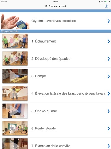 Programme d’exercices de renforcement pour personnes diabétiques de type 2 qui ont l’habitude d’en faire et qui voudraient aller un peu plus loin. Le programme a été conçu par une kinésiologue pour les personnes qui ne présentent pas de contre-indication médicale. Il s’agit d’un complément à votre activité cardio-vasculaire préférée comme la marche ou le vélo. Vous n’aurez pas besoin de matériel outre que des poids (qui peuvent être remplacé par des bouteilles d’eau ou un élastique). Disponible hors-ligne. Vous pourrez sauvegarder les valeurs de votre glycémie avant et après la séance afin de savoir comment votre corps réagit à ce type d’exercice. Bon entraînement!