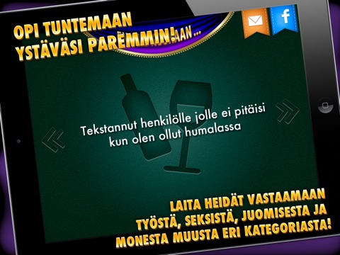 * Ravista, liuuta tai kosketa saadaksesi uuden kysymyksen! Helppokäyttöinen käyttöliittymä takaa uusien kysymyksien saamisen riippumatta... noh, päihtymyksestäsi.