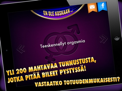 En Ole Koskaan... on paras sovellus illalliselle, bileisiin tai jatkoille. Tämä klassinen sovellus sopii jokaiseen sosiaaliseen tapahtumaan, mutta suosittelemme jättämään tämän pois perhetapahtumista (kyllä, opimme sen kantapään kautta).