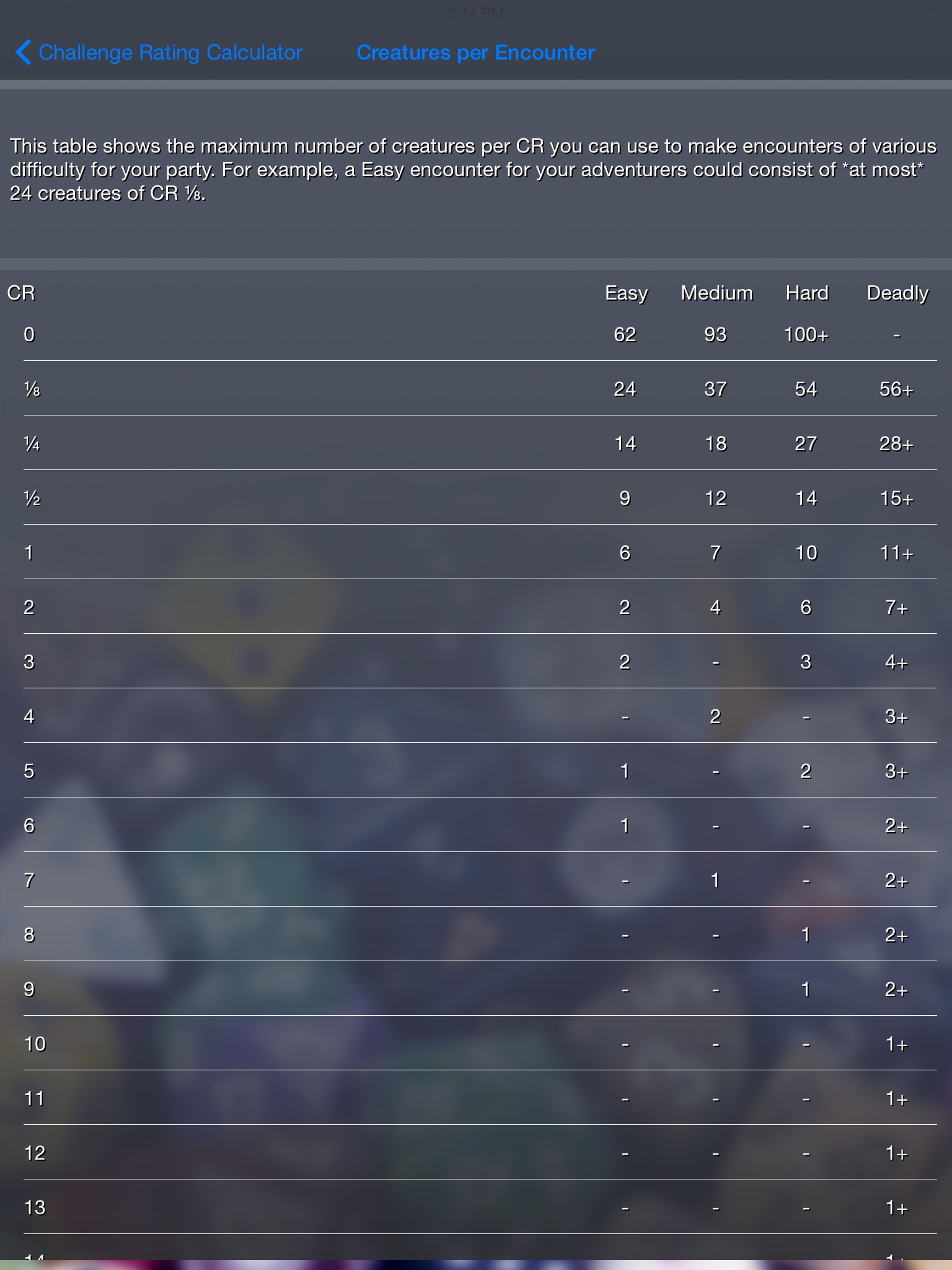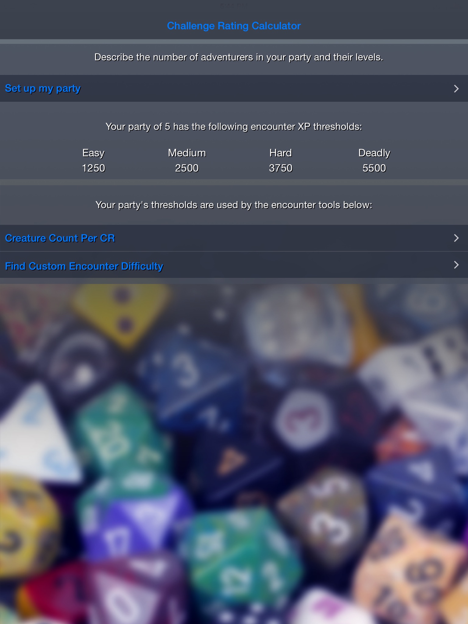 Once your party is defined, the app will tell you the XP thresholds appropriate for challenges of easy, medium, hard, and deadly difficulties. Those thresholds become the basis for a couple of other features: Creature Count per CR, and Custom Encounter Difficulty.
