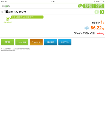 ・ecoランキング:お住まいのマンションで1ヵ月ごとに電気とガスのCO2排出量が少ない順位をランキングとして表示します。