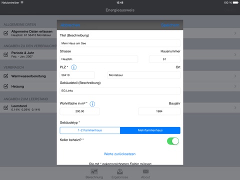 Mit dieser App errechnen Sie die Energieverbrauchskennzahl Ihres Hauses oder Wohnung nach der in Deutschland relevanten Energiesparverordnung (EnEV 2014). Diese ist ein wesentlicher Teil des deutschen Energieausweises.