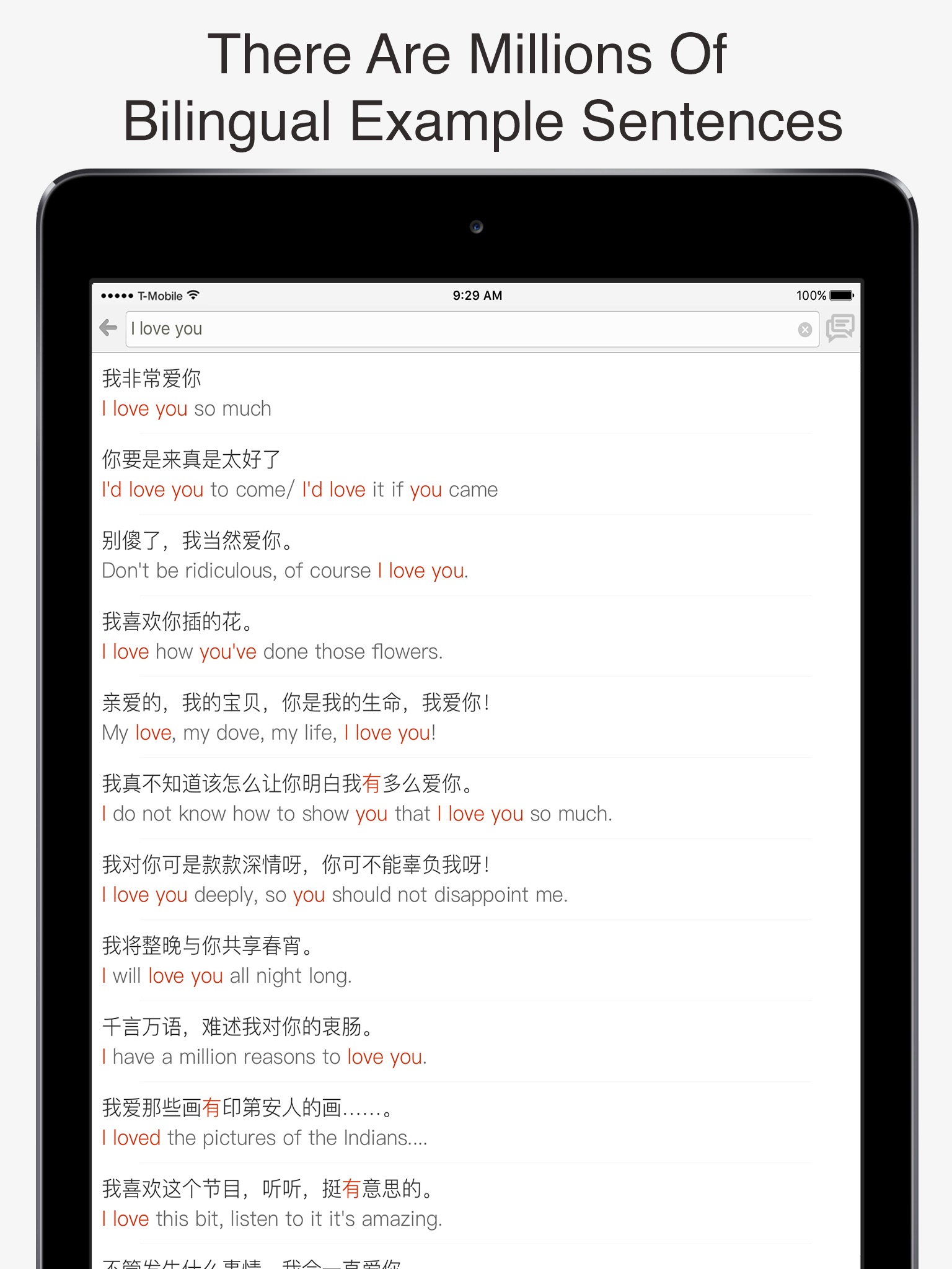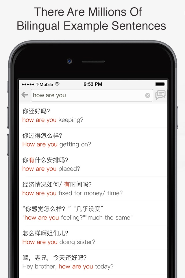 • Look-up for phrases in millions of high quality, hand picked dual-lingual English - Chinese sentences