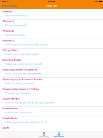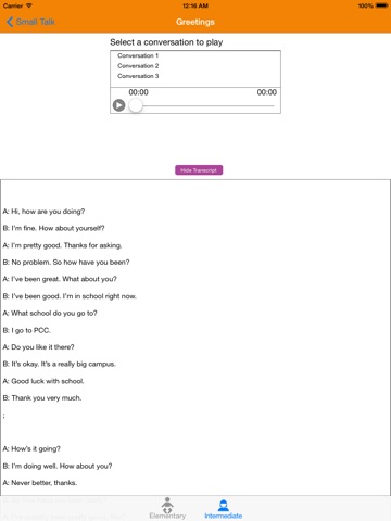 - "English Conversation (Free All Level) "is a helpful app to practice english conversation for everyone. With more than 2000 english conversations categorized in 2 levels: Elementary and Intermediate, you can strengthen your english speaking and listening skills perfectly. You are also able to bookmark lessons you like to learn in the future.