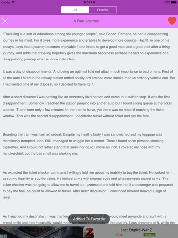 Its a free application that can help you working with English essay or writing task that your teacher gives you. Sometimes its hard to start the first paragraph and its always the first obstacle of wasting your time. With this app, you can find whichever topic that is related to what you are going to write and there will be some idea or opinion you can extract from it. As a result, it can help you finish your essay effectively. There are over 150+ free essays and will be added more in the next version, you can add to and remove from favorite, you can use it anywhere and anytime without the required of internet connection. Please rate and review. Thanks!