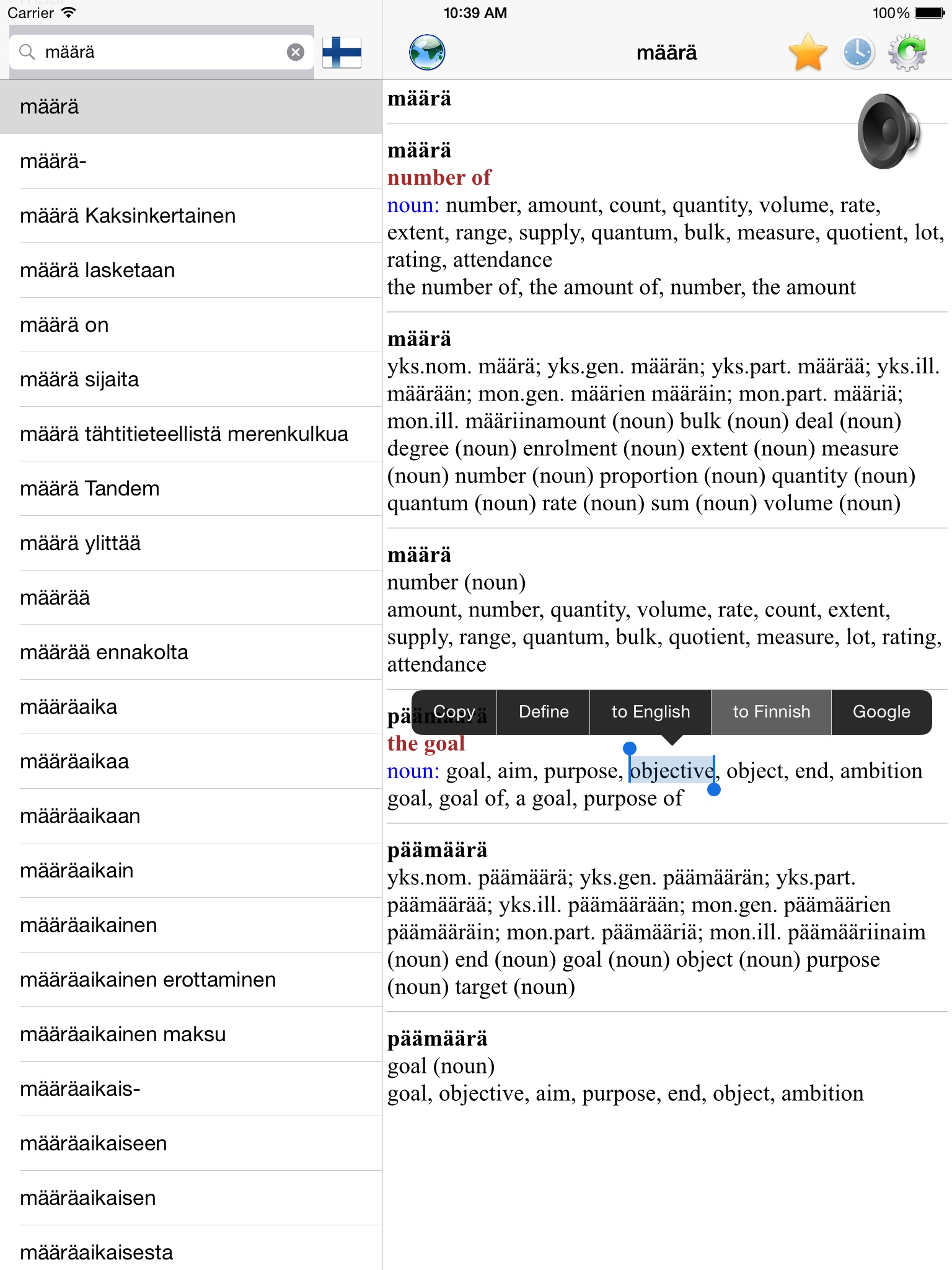 I dont know where they get the data but this is by far the most complete Finnish-English dictionary Ive found out there. But the UI could use some improvement. For example, a back button, the ability to tap words to go quickly to definitions, rather than having to long-press and select from a menu, and the ability to switch language direction on a single tap. It appears that the developer doesnt use the app themself and so doesnt get annoyed by these easily-improved niggles. UPDATE: After more than a year, NO updates to improve the UI. Its a shame, since the dictionary data is so good.