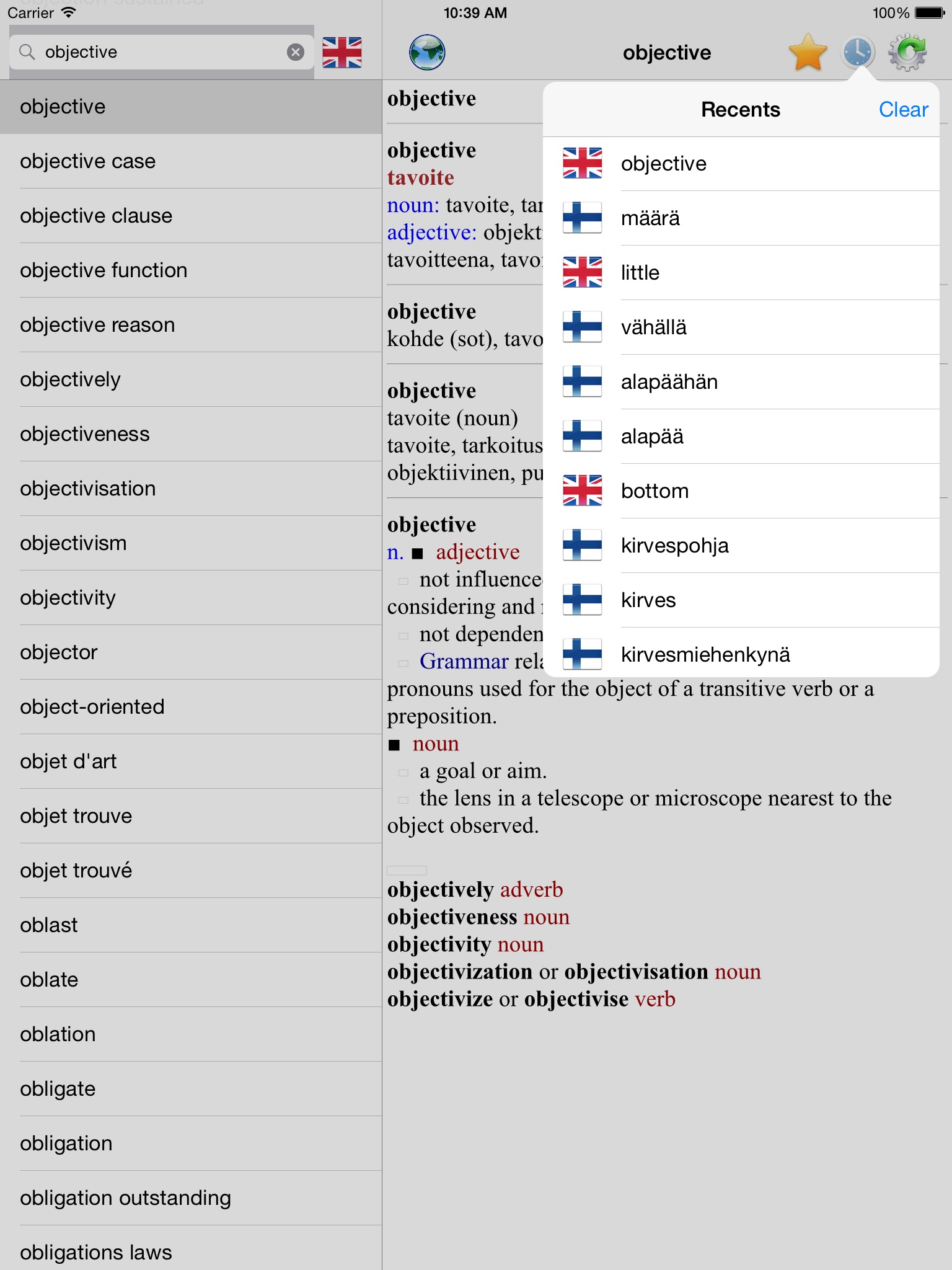I dont know where they get the data but this is by far the most complete Finnish-English dictionary Ive found out there. As far as the UI, its better than some, but nothing special. Could be improved by adding a back button, and letting us tap words to go quickly to definitions, rather than having to long-press and select from a menu. Switching language direction is also clunkier than it needs to be.