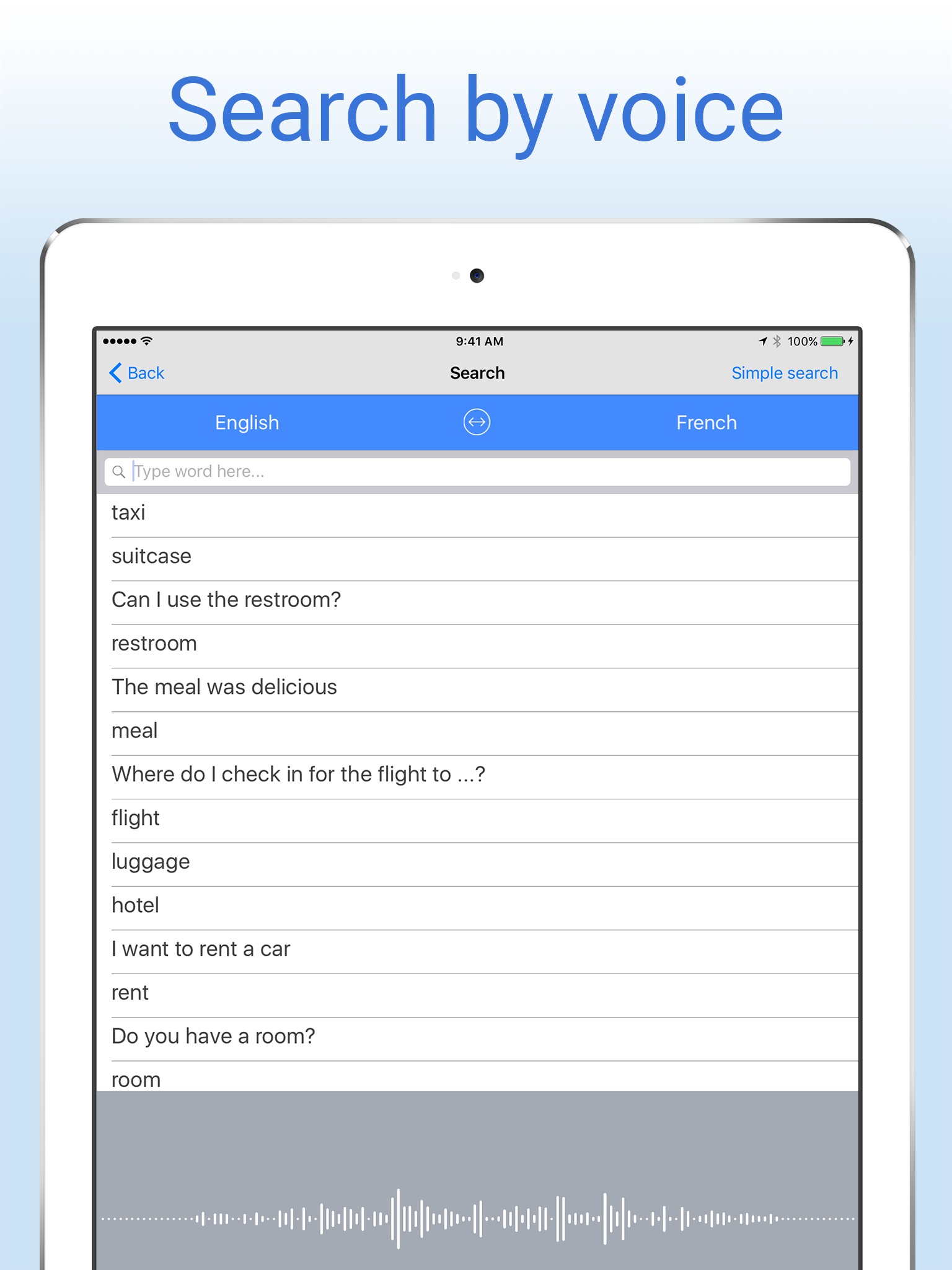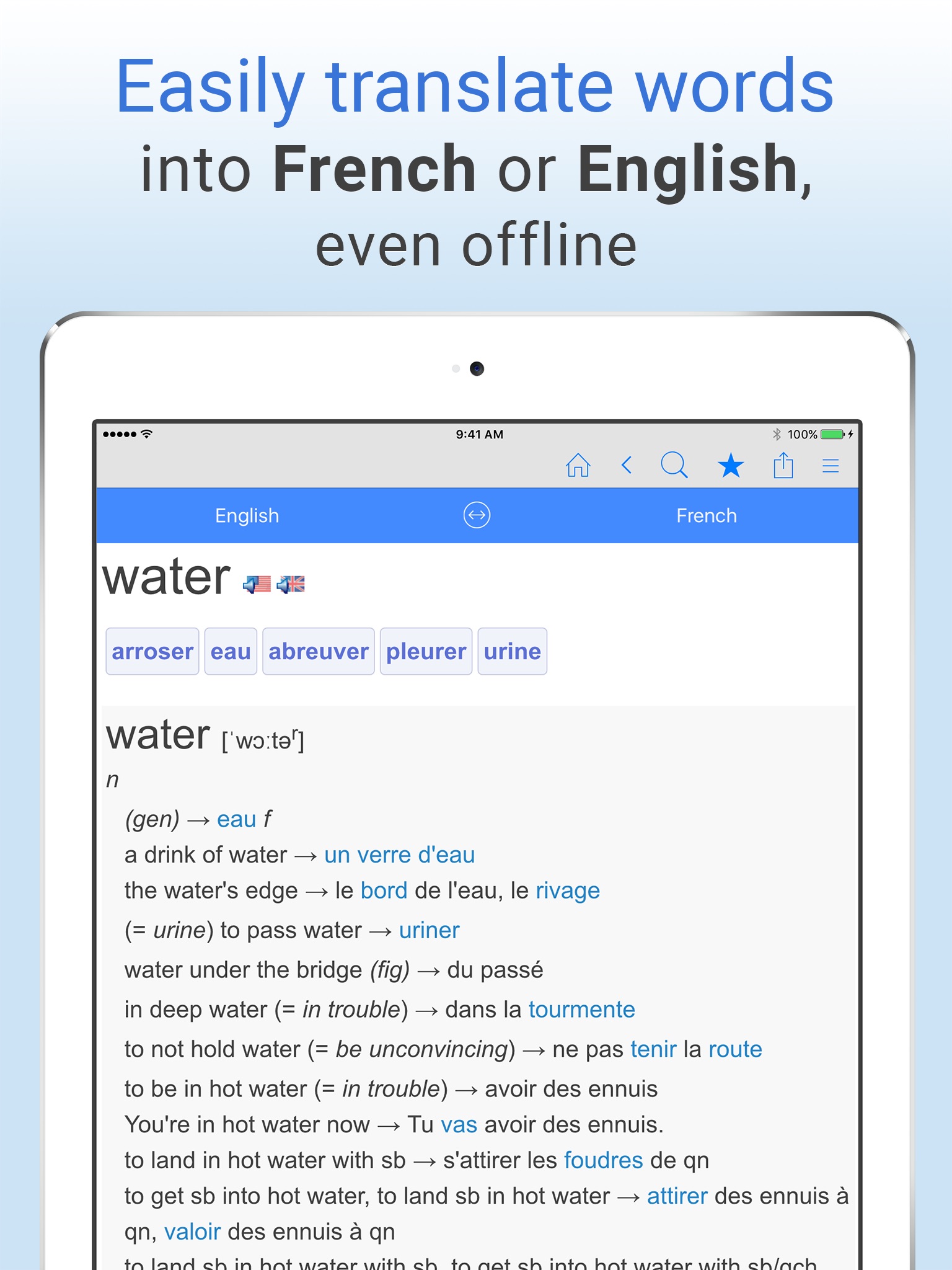 Free English-French translation dictionary and phrase translator. Translate words from English to French or French to English, even offline! Search by voice, play audio pronunciations of words, save unlimited bookmarks, and more. The perfect app for learning French or traveling to French-speaking countries!