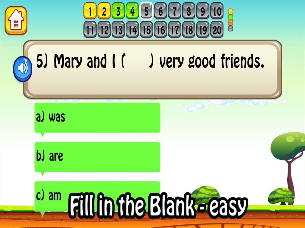 Educational and engaging, Grammar Patch merges English learning with pure fun. Complete sentences to check your understanding and then build them with or without audio cues. Arrange chunks of language to create sentences and then check your fluency rating. The English difficulty ranges from easy to intermediate to challenging, but just because you can answer a fill in the blank question does not mean you are fluent. With English Grammar Patch you will improve your English fluency at all levels, increasing your fluency with the English you already know and also picking up new expressions you may not have seen before.
