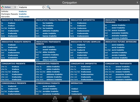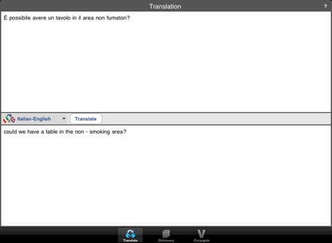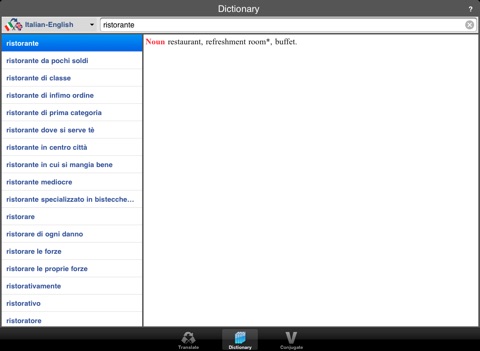 Translate full sentences from Italian to English and from English to Italian. Avoid to pay Internet connection fees with this 100% offline translator. Search words and phrases in dictionaries with over 125,000 entries. Conjugate verbs in several languages. Now, when traveling, you dont need a multilingual guide anymore. If you are in the hotel desk, in a restaurant or anywhere else, you can communicate with confidence in your own language.