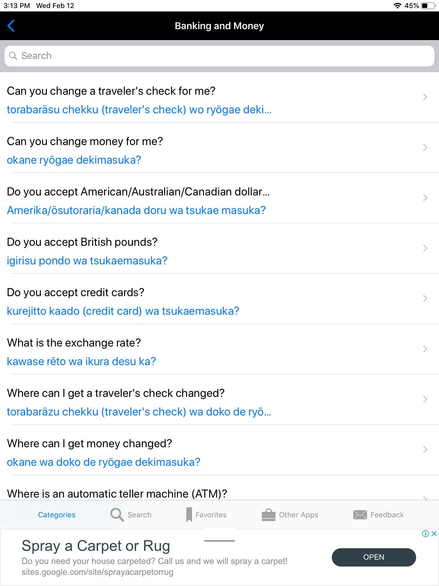 For the phrases the app contains, you get clear translations, phonetic pronucations, and audio - all without being connected to the internet (which is hugely important when travelling out of the US). The app also contains a useful organization struction. However, it is missing MANY common phrases. For example, under the "hotel" category, there is no phrase for "I have a reservation" or "I want a reservation." A very good app, and worth the 99 cents, but not all youll need.