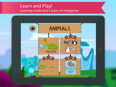There are 3 types of the fun games which train SPELLING and SPEAKING in English. The cute elephant Benny and his friend Gaby will entertain your child during the whole game. Smart heroes will read short DIALOGS and help to remember everyday phrases.