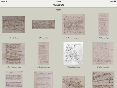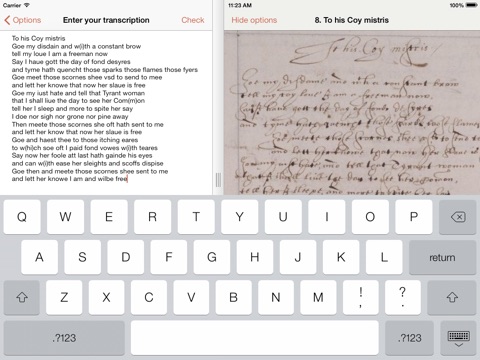 Users can examine 30 selected manuscripts, zoom in on individual words, attempt transcription and receive immediate feedback. They can optionally compare their transcription with a full transcript. The users transcripts can be saved and reopened. The saved transcripts are accessible via File Sharing in iTunes.