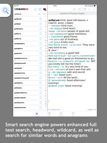 Хотелось бы, чтобы словарь был более доступным в плане его стоимости. На этом, наверно, недостатки заканчиваются. Разнообразие вариантов перевода поражает. Более полного англо-русского словаря, наверно, не найти в аппсторе. Был еще подешевле - был бы хитом! Купил уже не один словарь - есть с чем сравнить. На каждый день - он, скорее всего, не подойдет, но для профессионалов, людей серьезно занимающихся языком - это must have.
