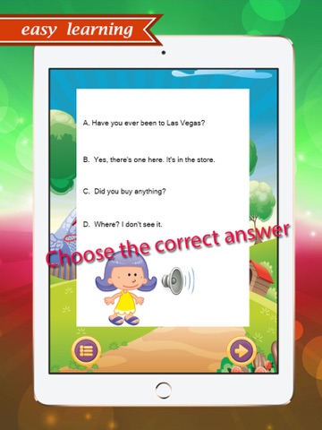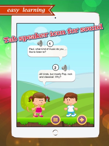 Learning English conversation and vocabulary for children, totally. This application has exercise testing. You can tap speaker icon for sound. Easy, fun and free.