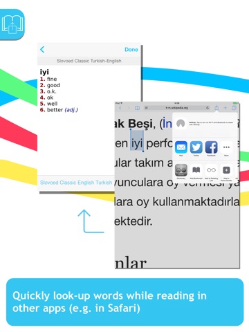 • New for iOS 9: You can now look up words while reading news, email, Safari sites, messaging or other popular apps! Select any text and send it to the dictionary via the “Share” button. All words available in the dictionary will be highlighted. To activate this feature, please select Slovoed as a sharing extension.