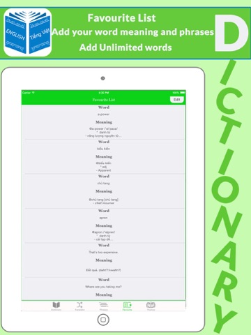 4- Almost all the commonly used words of both languages e.g. The English and Vietnamese are available here in dictionary, however in case of any exception user may take support of built-in Translator within application to find meaning of new words.