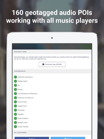 Echotags is very simple to use. Launch the app, turn on discovery mode and... thats all, it works. There is no need to buy guidebooks, check the Internet in advance or go to a tourist information center. Its a perfect solution for solo travelers and short time visitors.