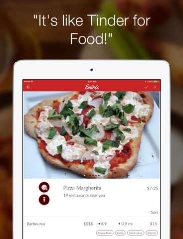 Bon Appétit, welcome to Entrée, the first personalized app that helps you decide WHAT to eat and WHERE to eat based on your palate. Think Tinder meets Pandora for your next meal.