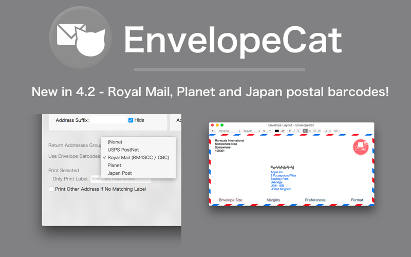 From EnvelopeCat 4.2 we not only support USPS PostNet postal barcodes but we also support, Royal Mail, Planet Barcodes and Japan Post!