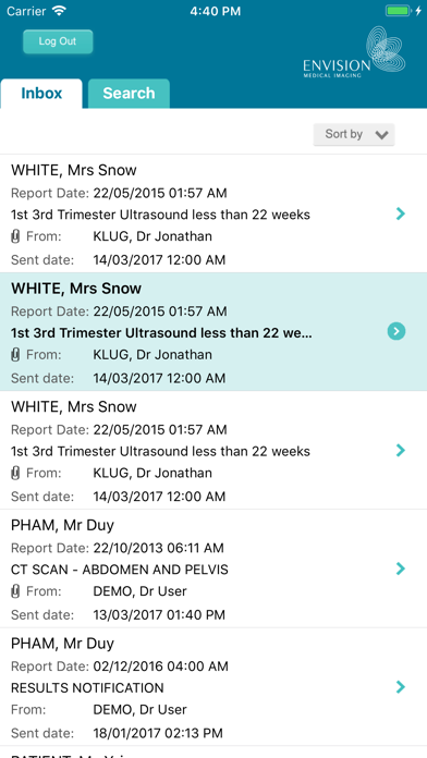 The inbox will show all unread reports and reports that you viewed less than 24 hours ago. If you wish to view a report not in the inbox (already read) click on the Search Tab next to the Inbox tab and you will be able to search for specific reports. The Inbox shows the same information as the browser based web portal shows.