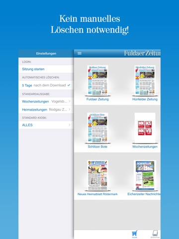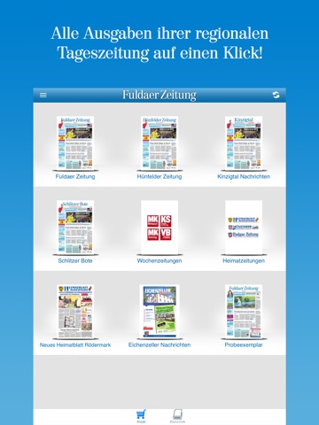 Die neue FZ-App vereint wissenswerte News und E-Paper in einer Anwendung. Informieren Sie sich im News-Bereich über ständig aktualisierte Updates zu den wichtigsten Nachrichten aus Fulda und Umgebung. Abonnenten der Fuldaer Zeitung, der Hünfelder Zeitung, der Kinzigtal Nachrichten und des Schlitzer Boten können im Kiosk bequem auf ihr E-Paper sowie ältere Archiv-Ausgaben zugreifen. Darüber hinaus können alle User in einer umfangreichen Bibliothek mit Gratismagazinen, wie etwa Stadtmagazinen und Freizeit-Stadtführer, stöbern.