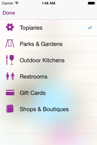 - Around Me feature (see which Topiaries or Kiosks are closest to you or even find the nearest restroom)