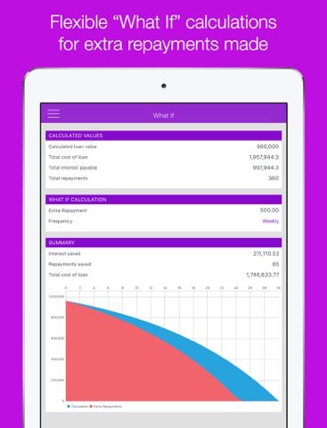 - Test scenarios to see what how quickly you can pay off your loan, and how much you will save by making extra repayments.