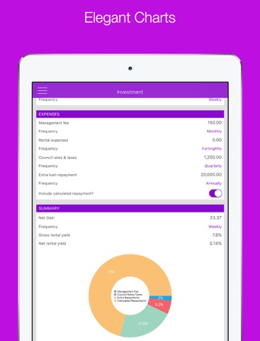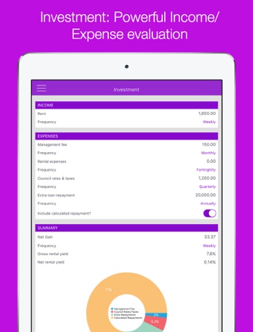 - Investment calculation facility to identify your Net Gain or Net Loss, as well as Rental Yield.