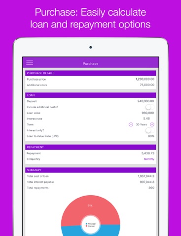 - Powerful purchase calculator displaying LVR, total interest and cost of your loan.