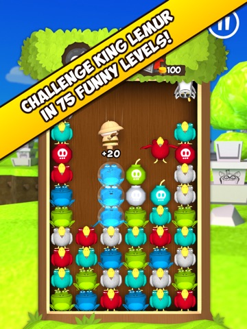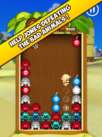 Jones, a brave explorer, must place small animals and bombs to blow them up, and can lift up individual animals or entire columns of them and move them to another position. For Jones, the goal is to free the tree of animals. Place three or more little animals and bombs of the same color in a vertical, horizontal or diagonal line to make them explode.