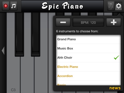 Choose from 6 available sound types (3 free): Grand Piano, Music Box, Ahh Choir, Electric Piano, Accordion and Banjo. More coming soon!