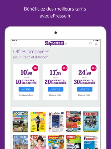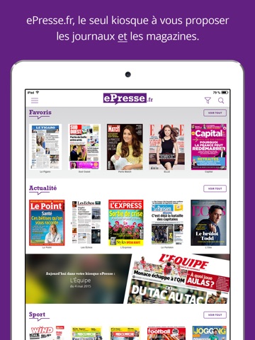 Enfin un format adapté pour suivre lactualité dans sa diversité, et qui sadapte à mes envies de la semaine. Avant je me perdais avec des dizaines dappli, désormais jutilise ePresse. En six mois lappli est devenue un réflexe : rapide, instinctive, personnalisée et surtout la seule à proposer le meilleur de la presse grâce aux grands quotidiens français disponibles en exclusivité. Je recommande !
