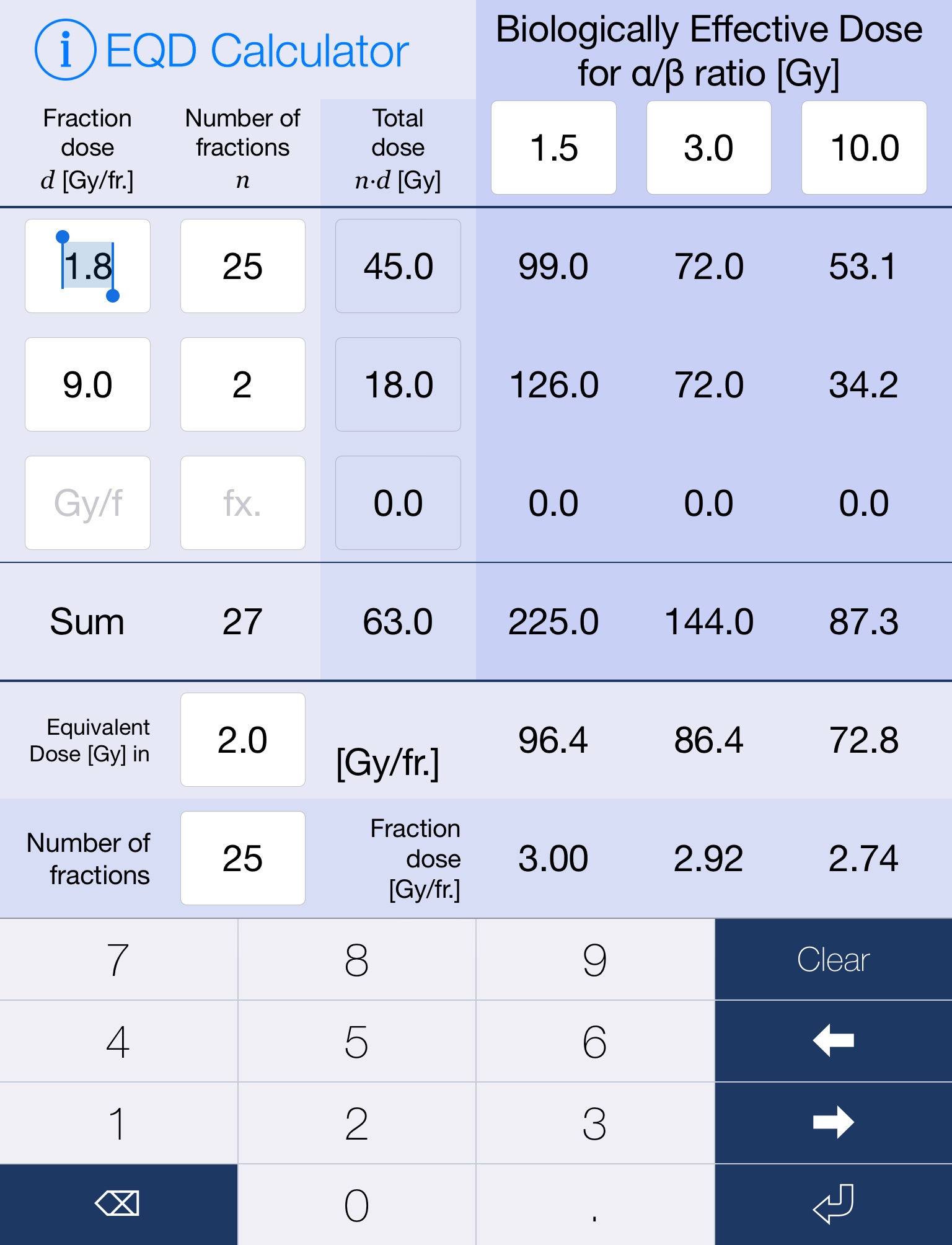 - This App can calculate these values together in three different conditions stated by three parameters (fraction dose or total dose, number of fractions and alpha/beta ratio), and summation of them automatically.