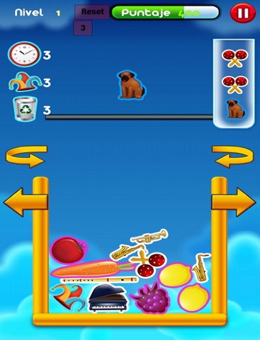 There are falling objects that you have to put into place, to group into the container. In order to move or rotate the items, you can use the buttons located on the sides. When you group four elements of the same category, in a way that they are in contact with each other, they disappear and points are added in order to pass to the next level.