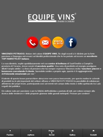 Vincenzo Petrucci, titolare del salone Equipe Vins, fin dagli esordi si è distinto per la forte passione e limpegno nel crearsi unidentità professionale che lo ha portato ad essere un eccellente Top Hairstylist italiano. La sua clientela, ospite quotidianamente nel suo centro di bellezza di Sant Onofrio a Campli in provincia di Teramo, riceve servizi di assoluta qualità. Una nota di positività ed energia avvolgono difatti lampio atelier. La linea di pensiero che ha sempre espresso Vincenzo recita "suscitare piacere e benessere coccolando il cliente, facendolo sentire a proprio agio, questo è il raggiungimento dellintensità emozionale per me."