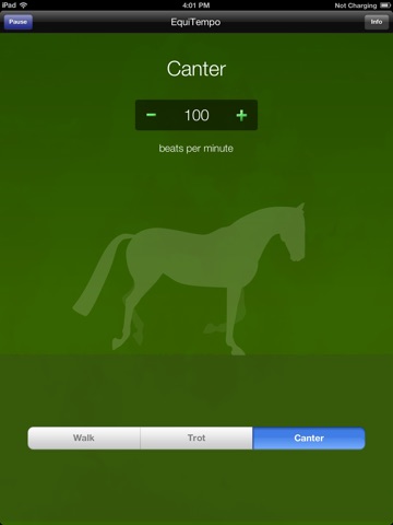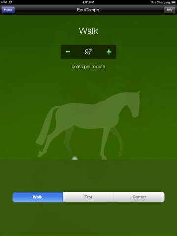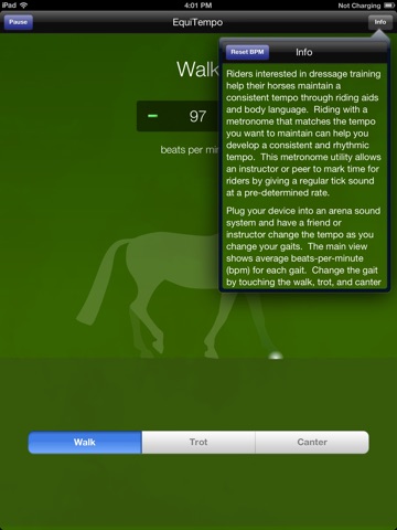 The main view shows average beats-per-minute (bpm) for each gait. Change the gait by touching the walk, trot, and canter buttons at the bottom of the main screen. Touch the add (+) and subtract (-) buttons to fine-tune the appropriate bpm for your horse. This app will automatically save the changes you make. Should you wish to reset the default bpm settings select the Reset BPM button on the ‘Info’ screen.