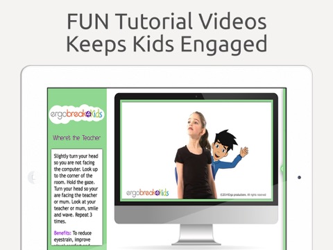 Ergobreak teaches kids to take breaks from their digital devices learning ergonomic tips and stretches exercises. Fun, easy-to-follow tutorials show kids the exercises that help to prevent common problems associated with their technology usage. Start teaching healthy lifelong technology habits by downloading Ergobreak 4 kids now.