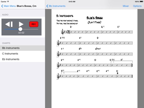 PDF lead sheets are included in the keys of C, Bb and Eb. These charts can be printed or emailed from the app. In the case of some well-known standards, we have adhered to the form and chord changes of the songs unless otherwise noted. The melodies to these tunes can easily be found on-line or in a RealBook, etc. There are also some classic tune forms from the post-bop era, making this collection up-to-date and relevant.