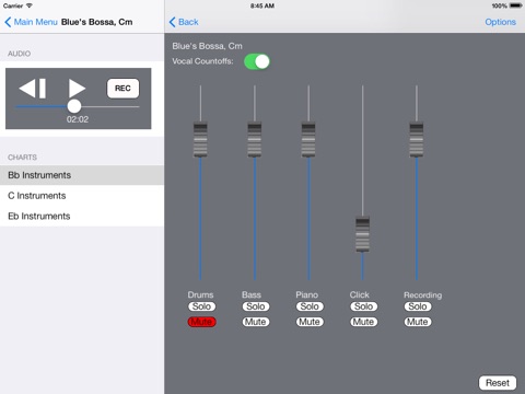 Utilizing the built-in mixer, you can create your own combo: full rhythm section (trio), music-minus-piano, music-minus-bass, music-minus-drums, or solo tracks of drums-only, bass-only or piano-only. There are click-track and count-off options as well.
