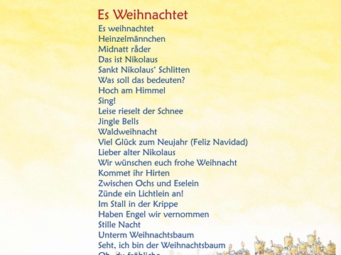 21 Lieder für die Weihnachtszeit zum Mitsingen und Musizieren, mit märchenhaften Weihnachts- und Winterbildern, Noten, Texten, lustigen und bezaubernden Geräuschen, Playbacks zum Mitsingen.