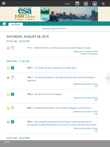 The 100th ESA Annual Meeting will be held on August 9-14, 2015 in Baltimore, Maryland. Login to view Sessions and Papers saved as favorites. View schedules, locations, floor plans, and people. Attendees will now be able to facilitate their experience at the meeting using the mobile app.