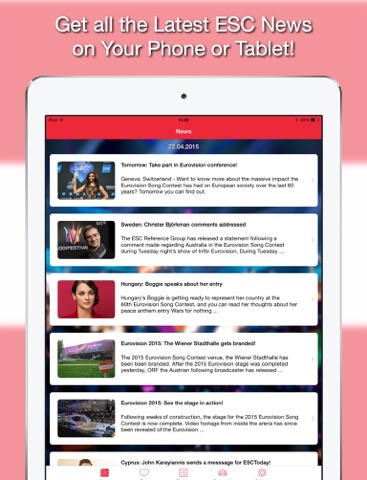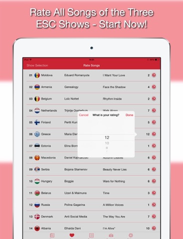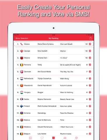 With ESC Rating you can easily remember which songs you liked the most. It will help you to rate all songs and provides you with all information about your favorite songs at a glance! View which songs the community likes the most and vote directly via SMS for the official televoting!