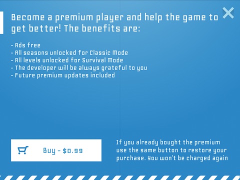 The game has two modes of playing, the Classic and the Survival. In the Classic mode there is five seasons and each season has eighteen levels. The player needs to play each level to get stars and unlock the next level and if it has enough stars the season. In the Survival mode the player will play all the levels from the Classic mode but the levels will be displayed randomly. The objective is to beat all the levels with just three lives.