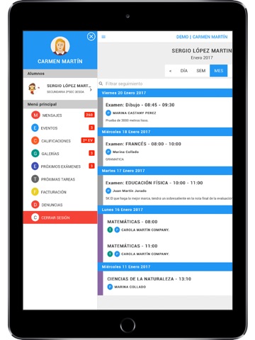 - Consulta el calendario escolar y mantente informado de los eventos, exámenes, tareas, tutorías y de todo aquello que sea relevante al alumno.