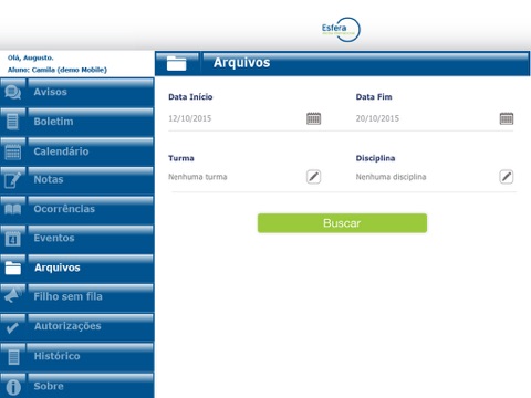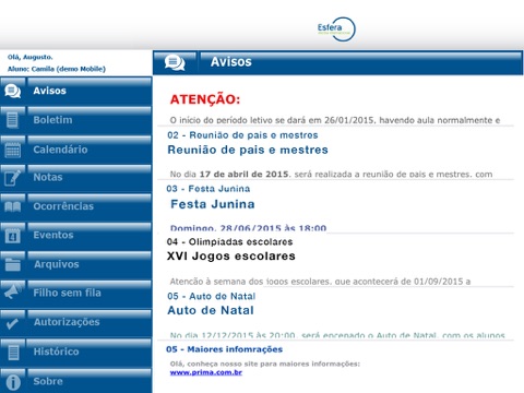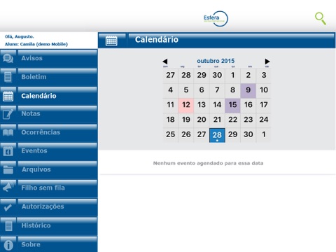 Aplicativo da Escola Esfera Internacional para prover informações acadêmicas a alunos, pais e responsáveis. Compreende a exibição de avisos da instituição, notas lançadas recentemente, consulta ao boletim escolar, ocorrências, calendário e próximos eventos.