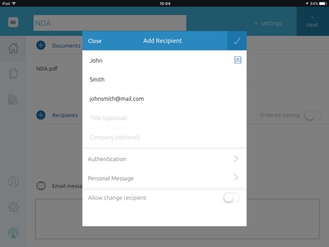 • Validate your signers’ identity using a variety of authentication methods directly in the app, including email, Q&A, and SMS text code