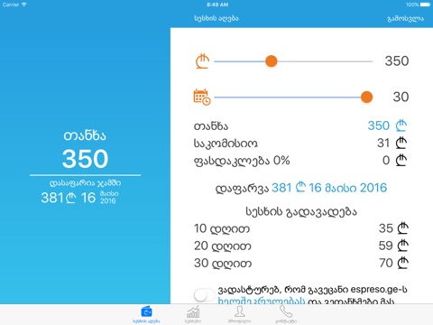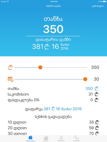 By this app you can take loan up to 1000 GEL. For 30 days or less. The least percent of commission. You will get the money within 15 minutes.