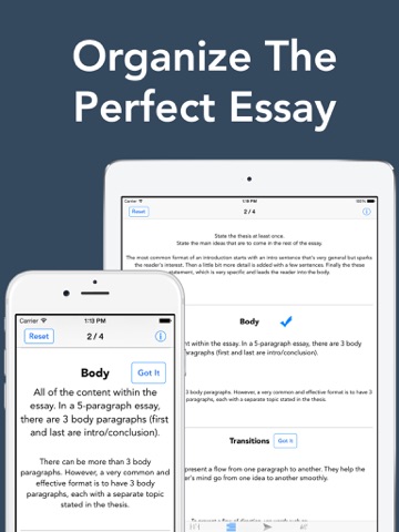This app is not intended to teach you what to write about in your essay, but rather go through the essential items in a well-written essay and pushes your essays quality goes from good to excellent.